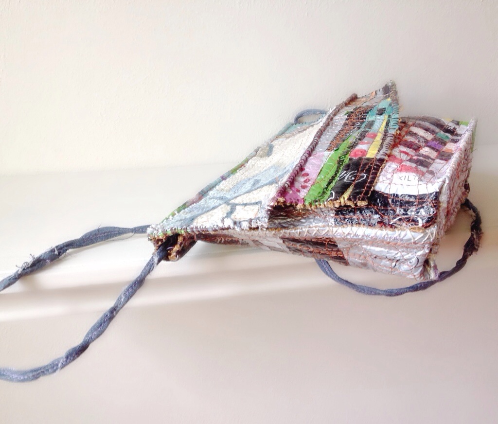 Over the years, my style evolved to include more recycled fabrics, instead of plastic. Thought I would try it out again, after looking back at some of my photos and thinking that they had a different kind of interesting look. Here are a couple of new creations, in the old style.