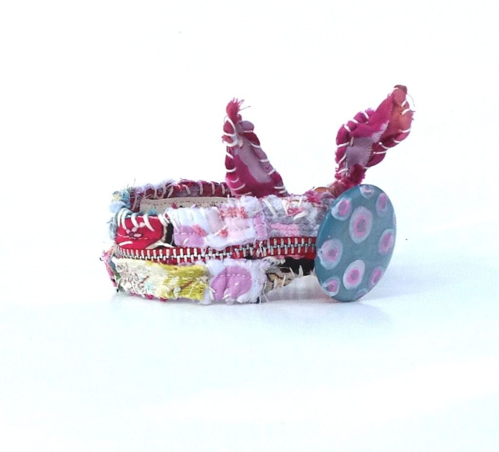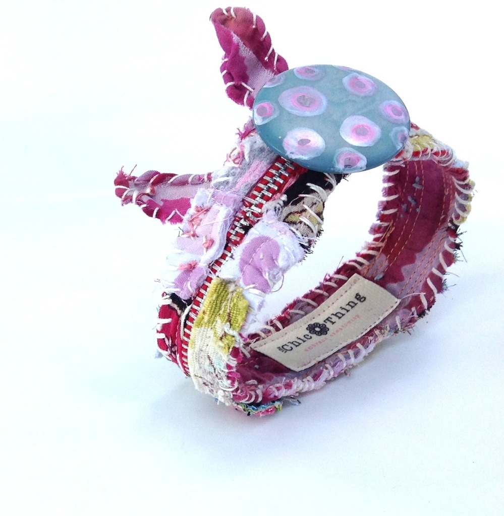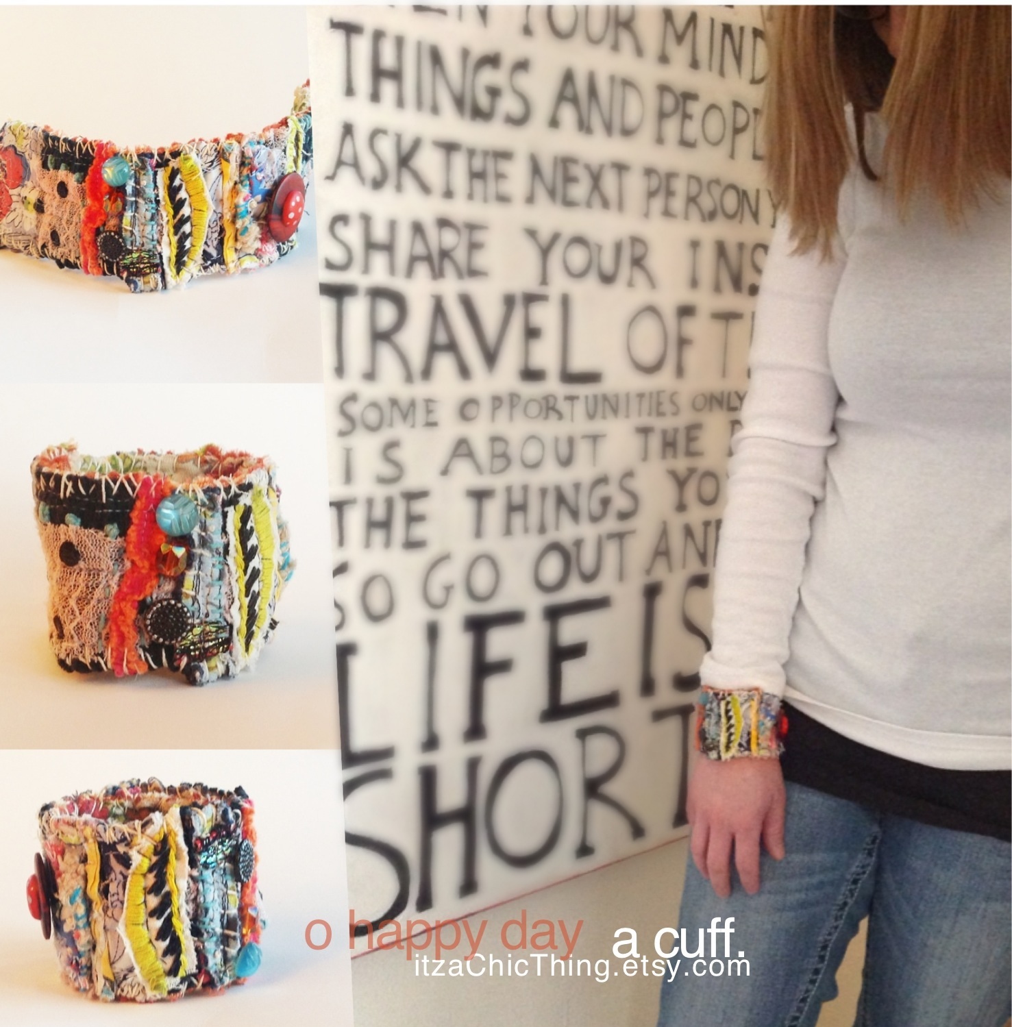 Artsy upcycled cuffs found at http://itzachicthing.etsy.com. (quirky one-of-a-kind bags and headbands, too)