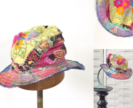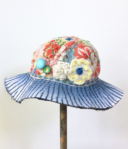I started experimenting with making hats when I found a set of wooden hat forms at an estate sale. They’re created free-form, bricolage style by layering fabrics, molding,cutting, stitching until I get the look that I want. I love the way this one turned out, it’s one of my favorites. It sold at a local event where I set up my upcycled vendor cart…here’s a photo of the cart: