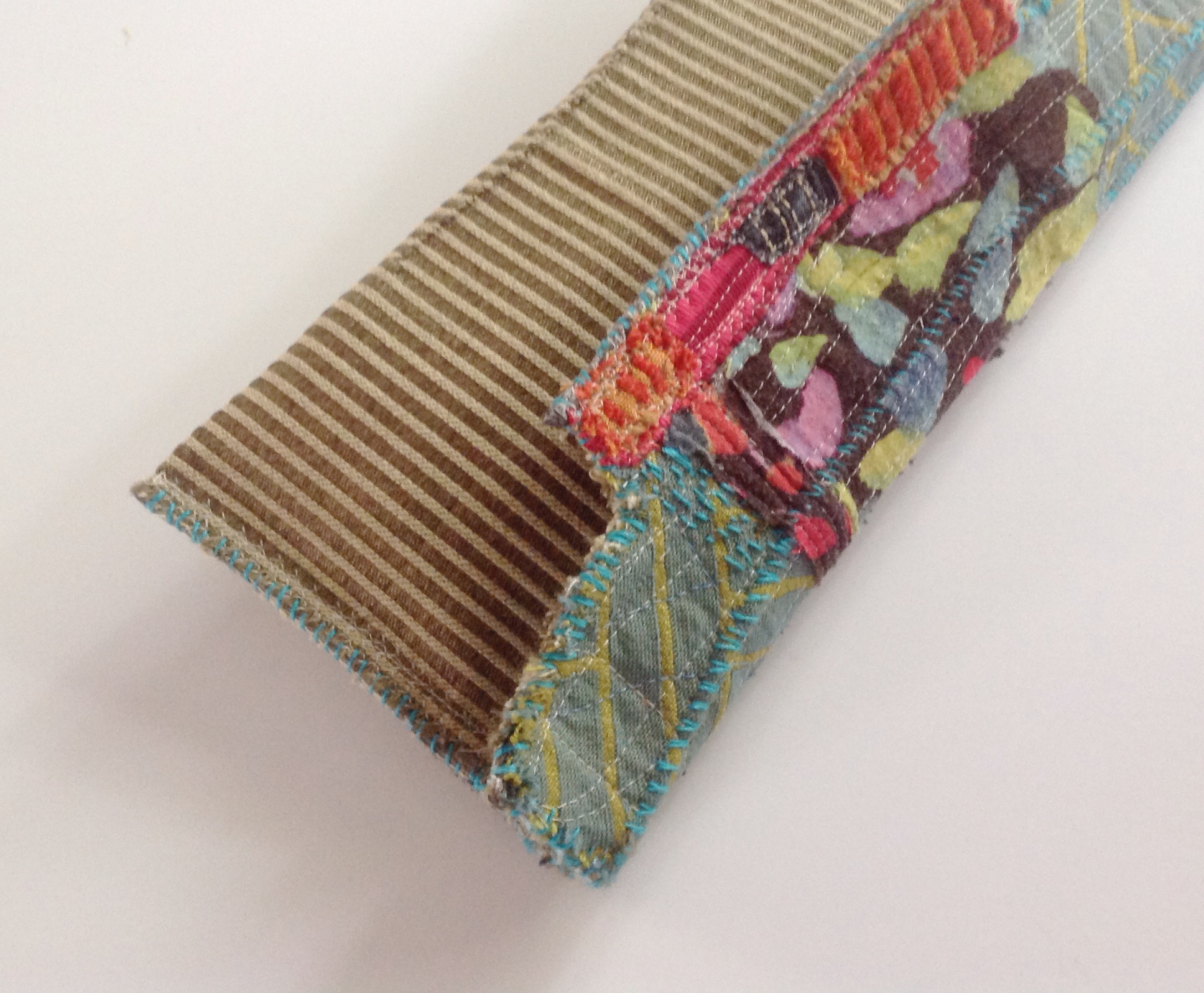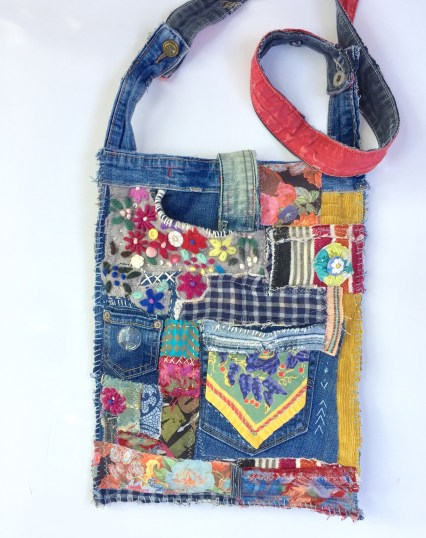 upcycled using upholstery fabric samples, denim, denim pockets, vintage – lace, pearl buttons, embroidery and random bits of fabric