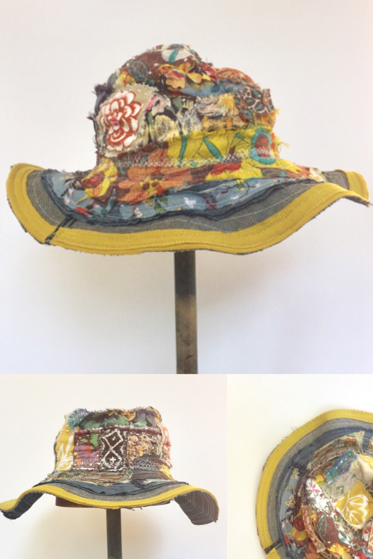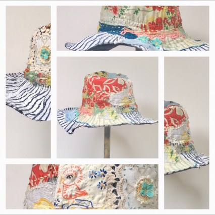 I started experimenting with making hats when I found a set of wooden hat forms at an estate sale. They’re created free-form, bricolage style by layering fabrics, molding,cutting, stitching until I get the look that I want. I love the way this one turned out, it’s one of my favorites. It sold at a local event where I set up my upcycled vendor cart…here’s a photo of the cart: