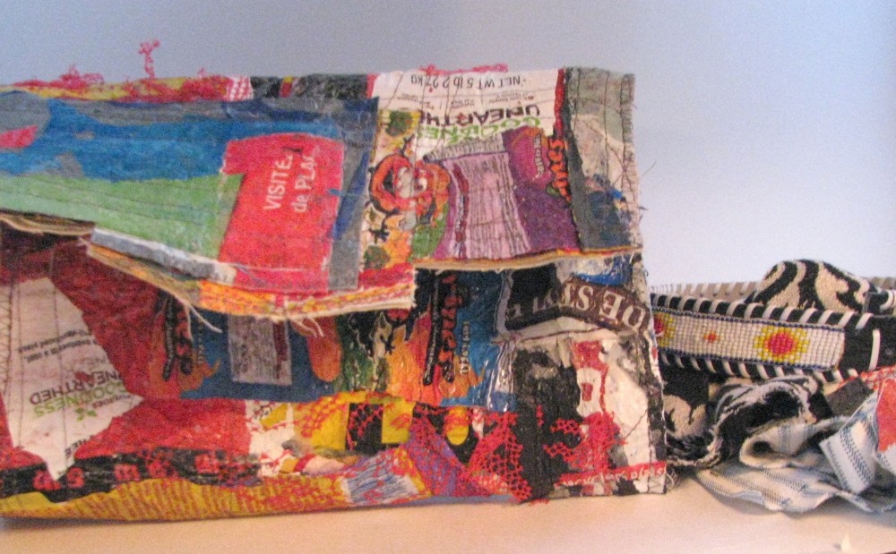 This very merry, boho, upcycled bag is made with fused recycled plastic bags, vintage beaded belt, & scrap fabric. One-0f-a-kind design. $75. (pictured below: front & backside)